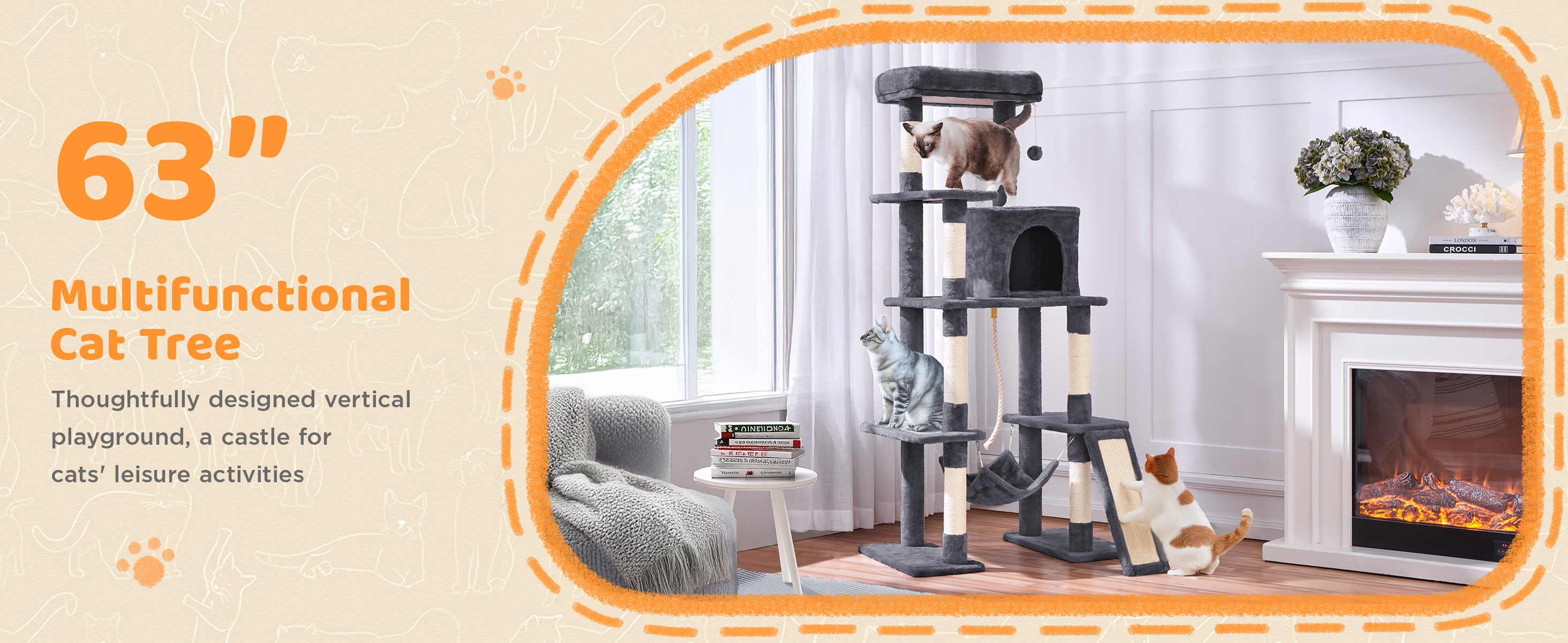 MarvelPaws Large Multi-Level Cat Tree| 63 Inches Tall with Sisal-Covered Scratching Posts, Condo, Hammock, Dangling Ball, and Extended Platform for Cats to Play and Sleep